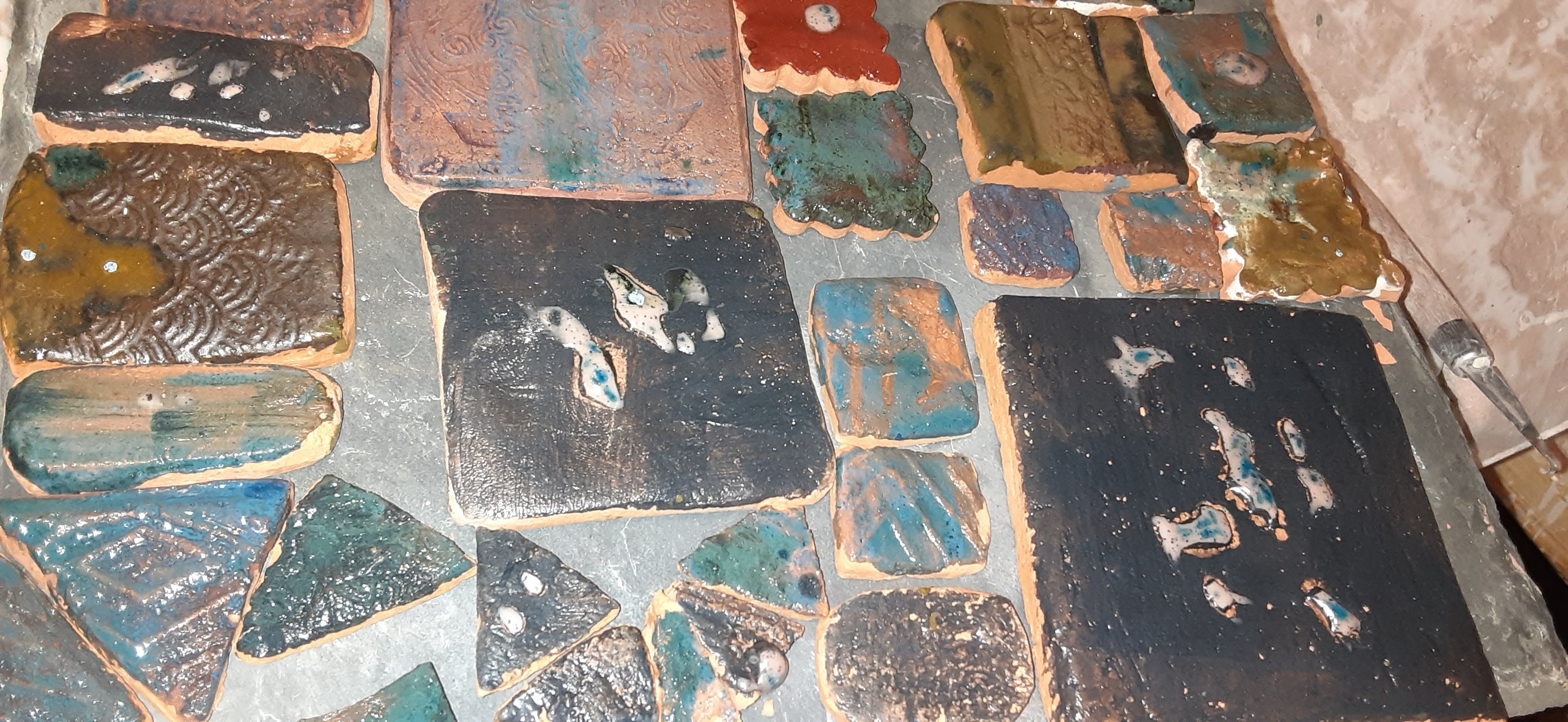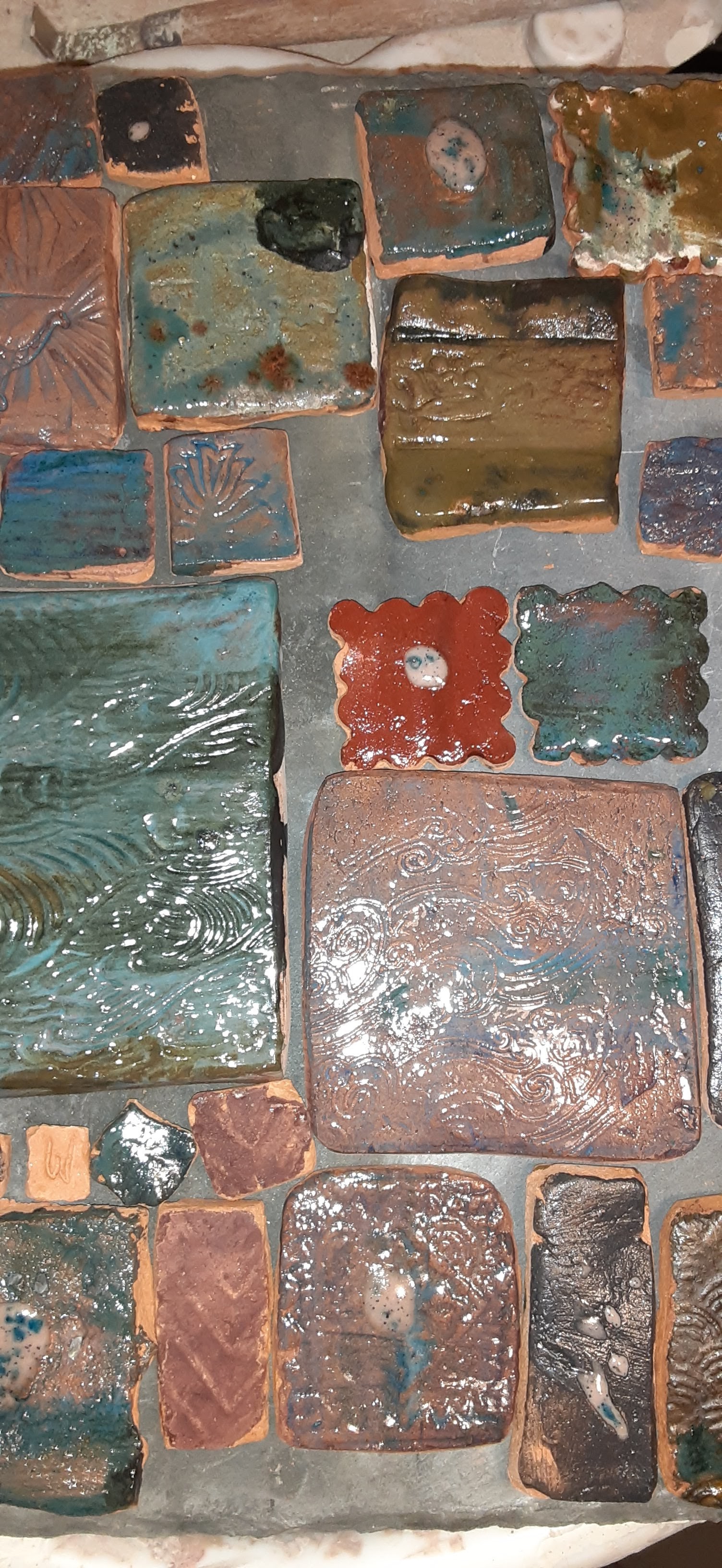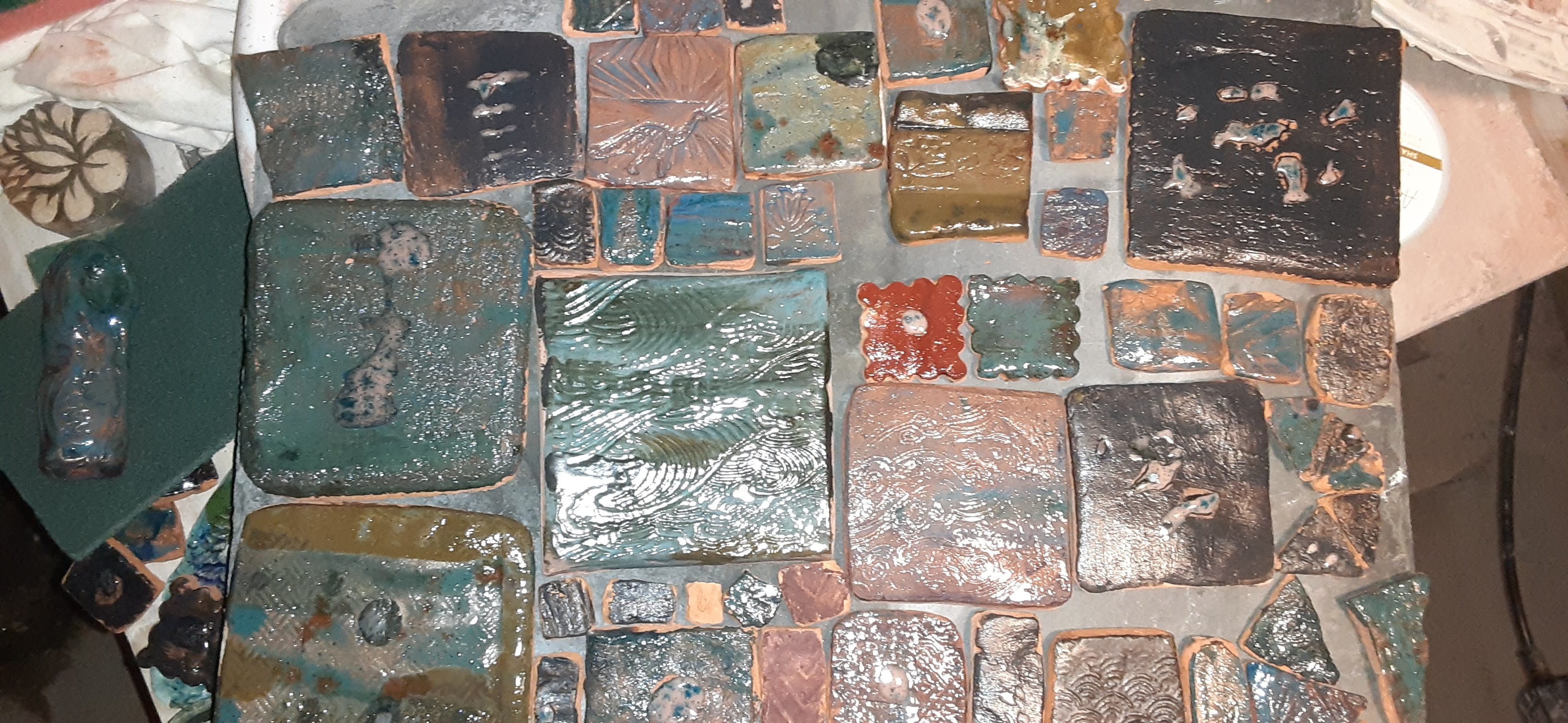 Sometimes the best projects take lots of hands, a lifetime of learning and unlimited amounts of energy. This tile project was developed from a summer of processing the clay from the house I grew up in on the land I gardened in on the space that was about to hold the pool. A dozen kids helped shovel, mix, poor, strain, crumble roll, design and glaze.