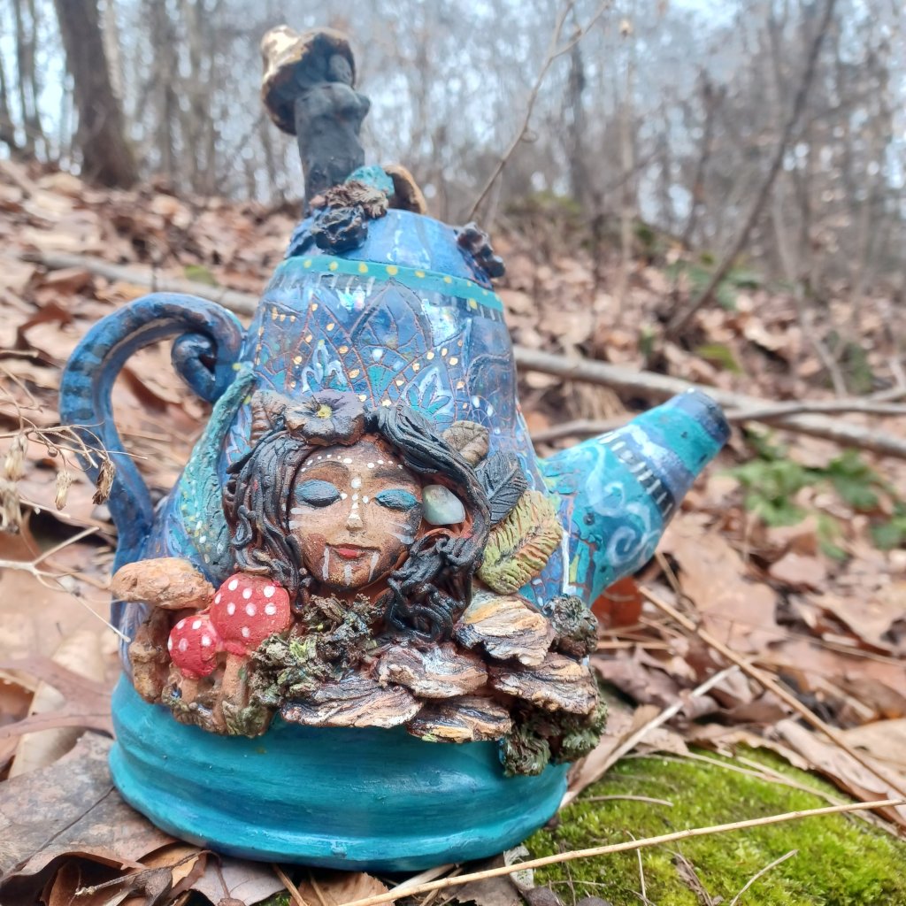 Experience the enchantment of the magic teapot, infused with full moon waters for powerful rituals. Adorned with goddess symbols and natural elements like fungi, feathers, and crystals, this one-of-a-kind piece is finished with 22k gold glazes. Embrace the mystical energy in every sip with this uniquely crafted teapot. smoke from the lid with a golden fungi goddess