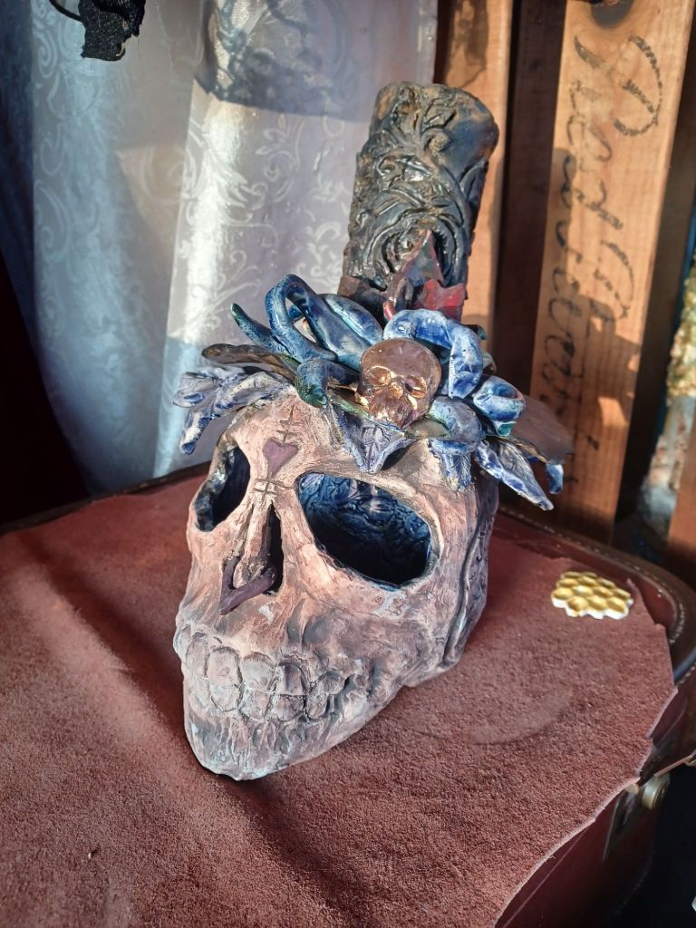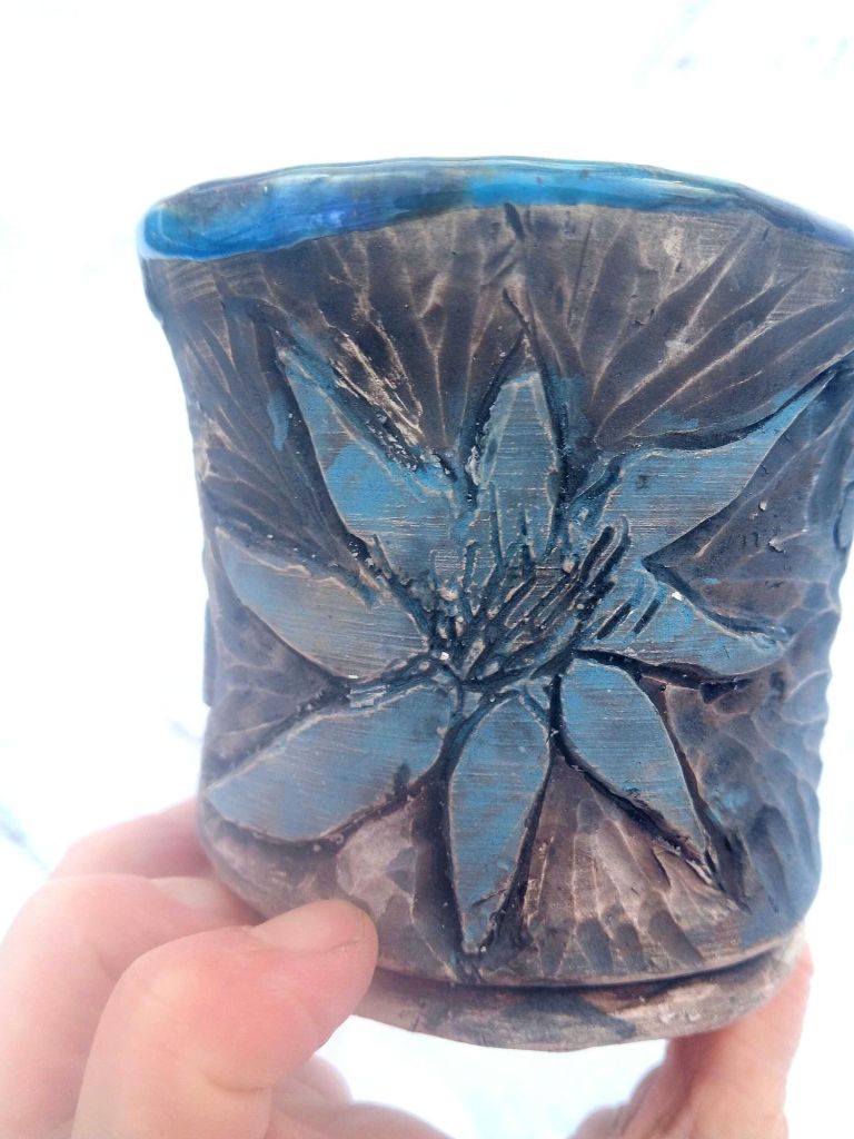 Hand carving into clay has become one of my great loves when it comes to clay. This style is deeper than sgrafitto which is just a surface scratch. This is deeper bringing pieces to a 3-d. Washed with iron and hand carved flowers are then glazed. Check out more work if you like this style and want to see more. All pieces go to supporting our non profit!!
