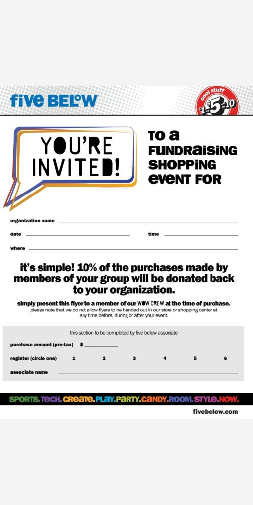 Between November 24th and November 30th print this flyer and take to 5 below to help us raise money for our non profit